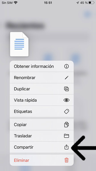 Gehe zum Ordner „Dateien“ und suche die Datei, die du gerade heruntergeladen hast. Halte die Datei gedrückt und tippe im erscheinenden Fenster auf Teilen.