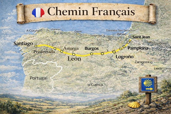 Le Chemin Français est l’axe central de la pèlerinage jacquaire depuis le Moyen Âge. Il a été le principal canal d’échanges culturels, religieux, économiques et sociaux entre l’Europe et la péninsule Ibérique. Des villes comme Pampelune, Logroño, Burgos, León, Astorga et Saint-Jacques-de-Compostelle se sont développées grâce au passage continu des pèlerins au fil des siècles.