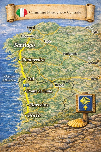 Il percorso da Porto a Tui attraverso l’interno del Portogallo, seguendo il tracciato del Cammino Portoghese Centrale, totalizza 123,9 km. Questo tratto corrisponde all’itinerario completo in Portogallo fino all’ingresso in Galizia attraverso la frontiera ispano-portoghese. - Tui – Santiago de Compostela (tratto galiziano):